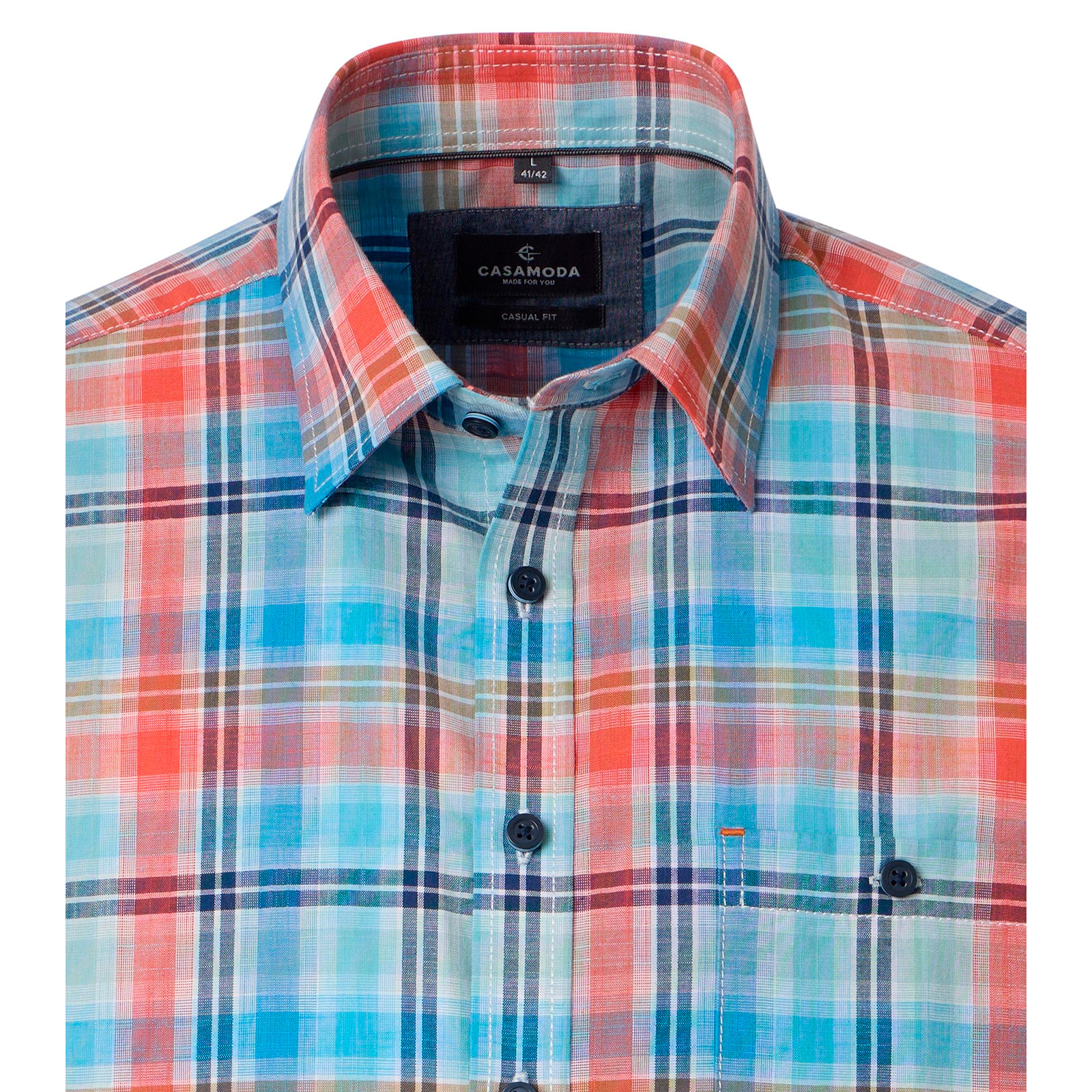 Dieses Kurzarmhemd in großen Größen von Casa Moda überzeugt mit einem farbenfrohen Karomuster! Der Kentkragen unterstreicht die gepflegte Optik, während die Brusttasche mit Knopf das Design funktional ergänzt. Der Casual-Fit-Schnitt in verkürzter Länge (Short Style) sorgt für eine moderne Passform und bietet gleichzeitig angenehme Bewegungsfreiheit. Die hochwertige Baumwollqualität garantiert zudem ein angenehm leichtes und luftiges Tragegefühl - ideal für warme Tage.