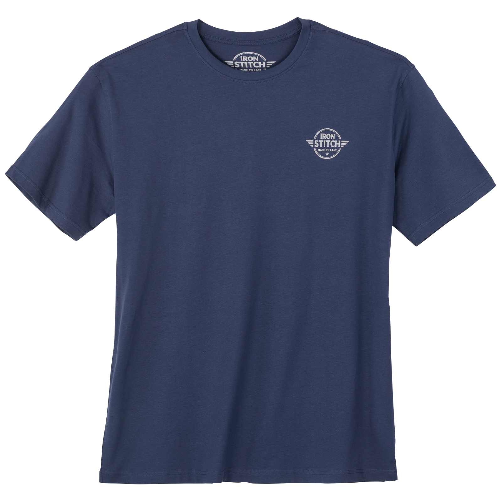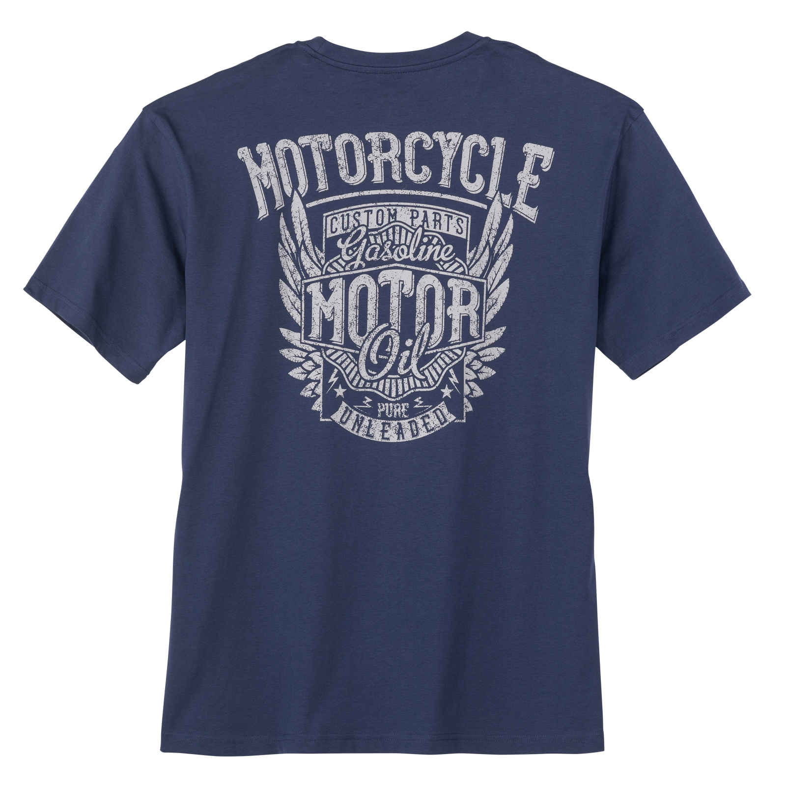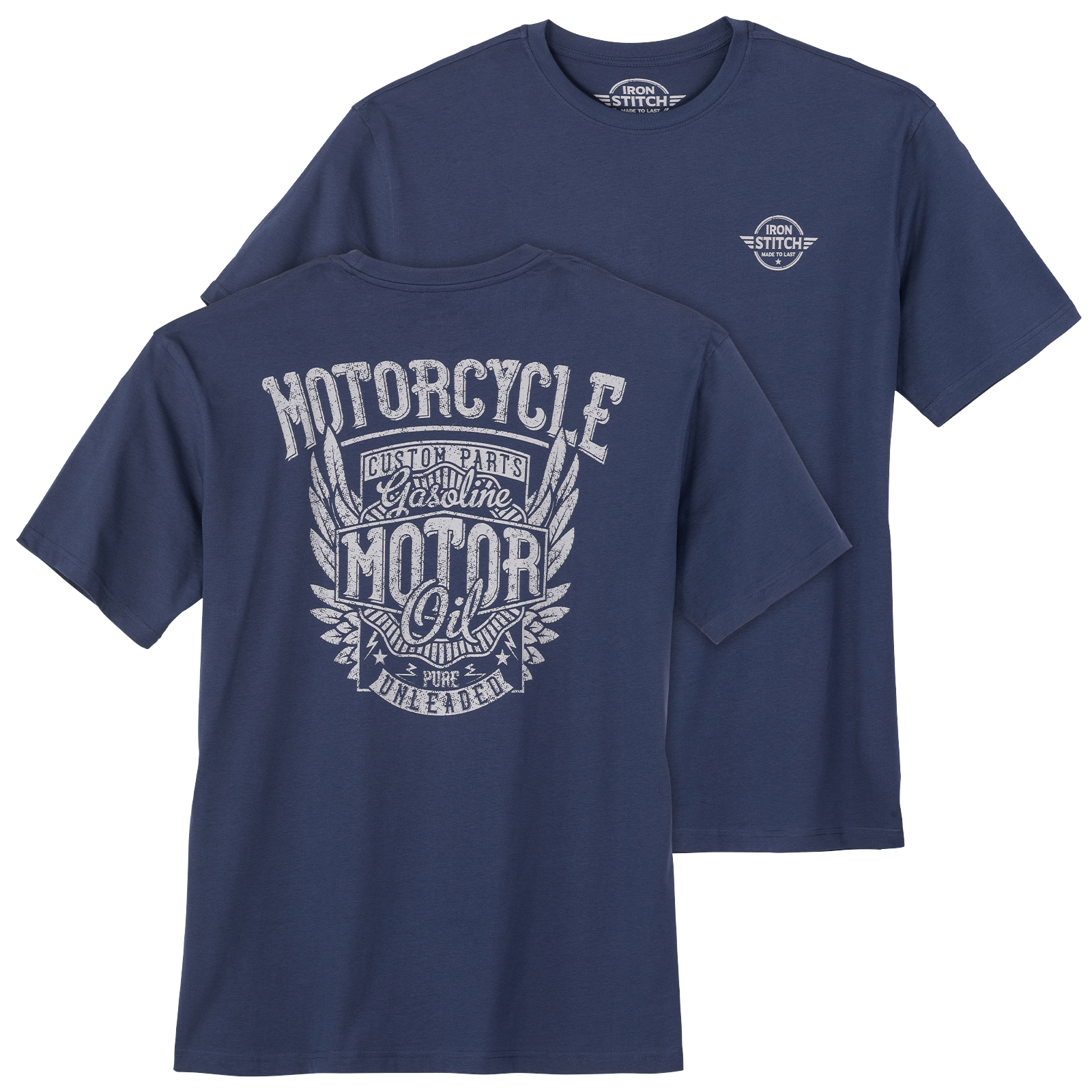 Iron Stitch T-Shirt denimblau mit Brust- und Rückenprint - Modell: Motorcycle