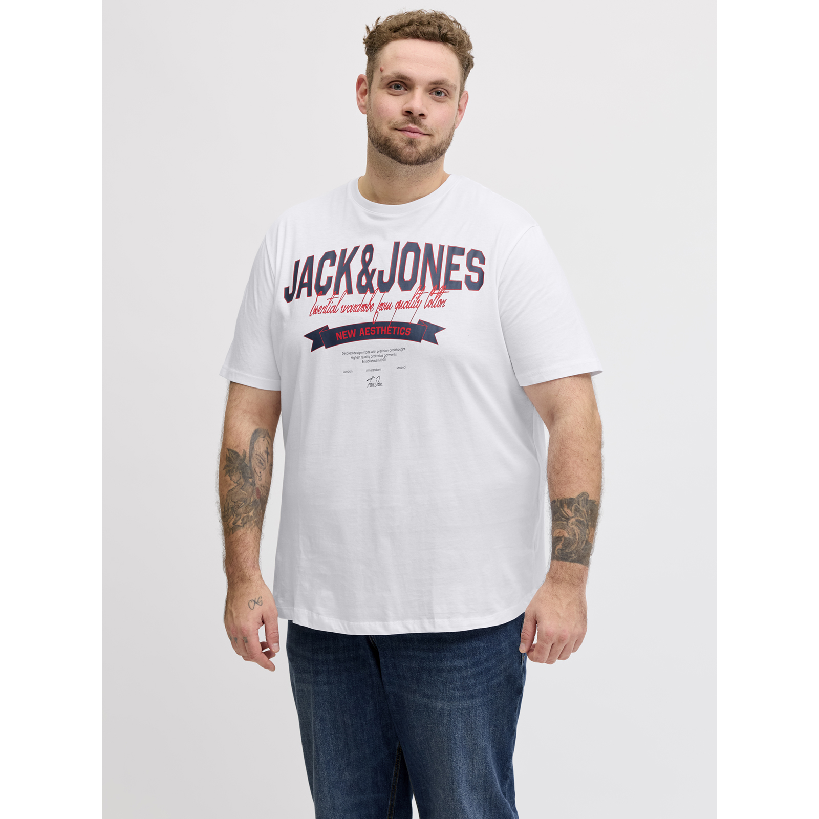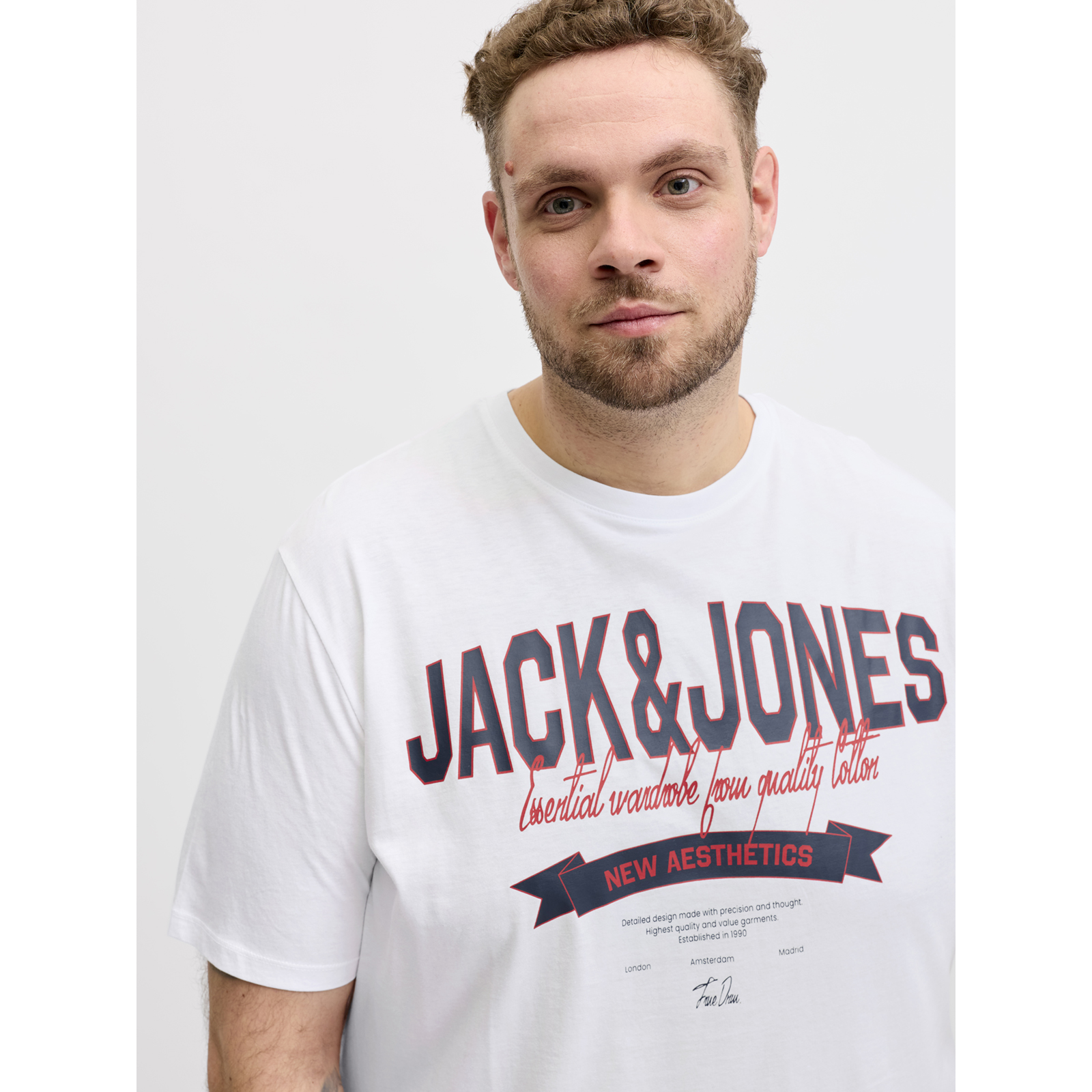 Dieses Übergrößen T-Shirt von Jack&Jones setzt mit seinem markanten Logoprint eine stylischen Akzent in ihrem Outfit! Die reine, weiche Baumwoll-Qualität fühlt sich angenehm auf der Haut an, während der bequeme Schnitt und der elastische Rundhalsausschnitt für höchsten Tragekomfort im Alltag sorgen.